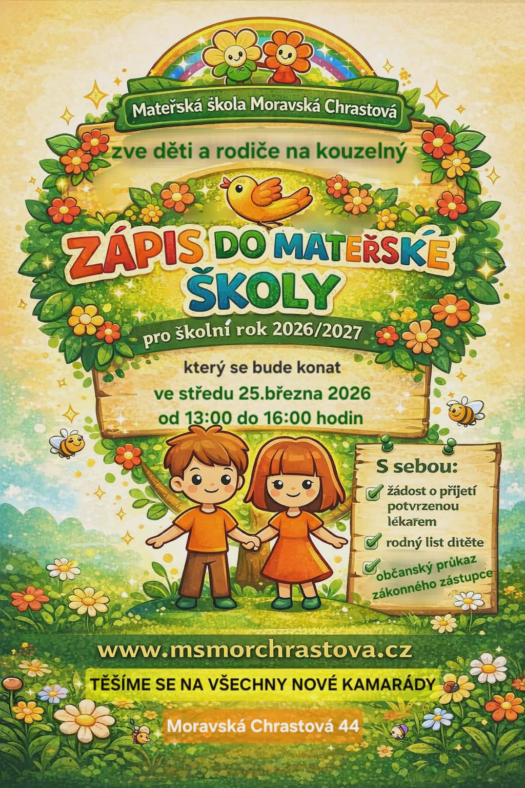 • Dne 23.5.2012 od 9h – 15h proběhne v budově MŠ zápis na školní rok 2012/2013. Podrobnosti budou zveřejněny na zvláštním letáku