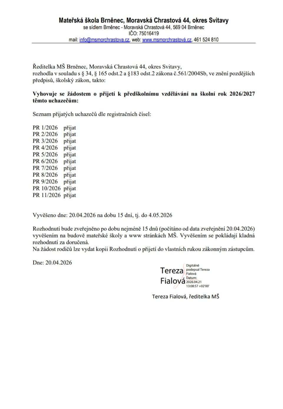 ROZHODNUTÍ O PŘIJETÍ K PŘEDŠKOLNÍMU VZDĚLÁVÁNÍ NA ŠKOLNÍ ROK 2025/2026 DLE REGISTRAČNÍCH ČÍSEL